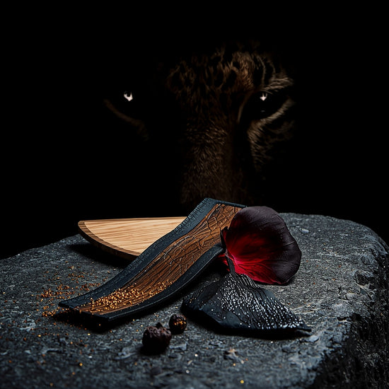 Mentre la fragranza si evolve, si assesta in una composizione profonda e terrosa in cui note di rosa speziate si intrecciano con calde sfumature legnose. I ricchi legni marroni e l'oud fumoso evocano il mantello liscio della bestia selvaggia, creando un profumo che è sia seducente che potente. Mentre si asciuga, i sottili toni coriacei indugiano dolcemente, esaltando la raffinatezza complessiva della fragranza.